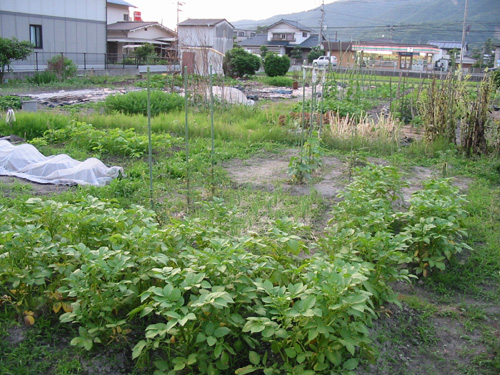 | 私の住むマンションのすぐ横に、年間3000円で借りている5坪の市民菜園。実家に1反(約1000平方メートル)の畑がありますが、5坪でさえ・・・。毎年、今年こそはと意気込むんですが、夏場はいつも草ぼうぼうです。本当に、今年こそは・・・・。 |