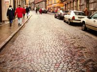 | マクドナルド | 建物の樋の雨水が歩道へ? (ガムラスタン) | 車道小石舗装パターンは欧州共通 (ガムラスタン) |